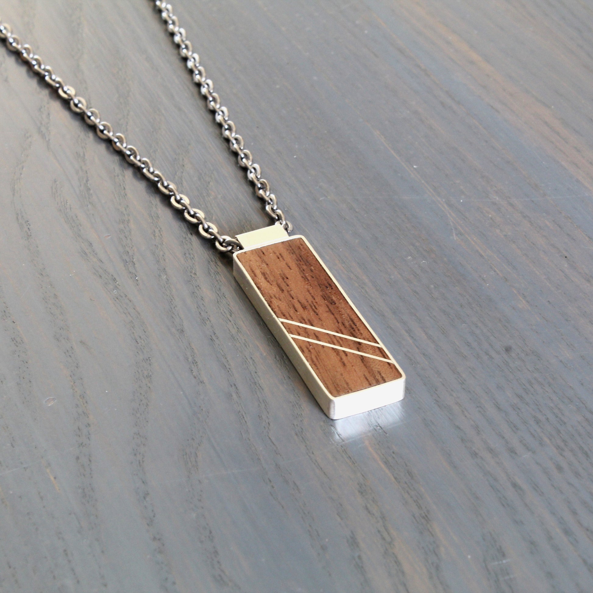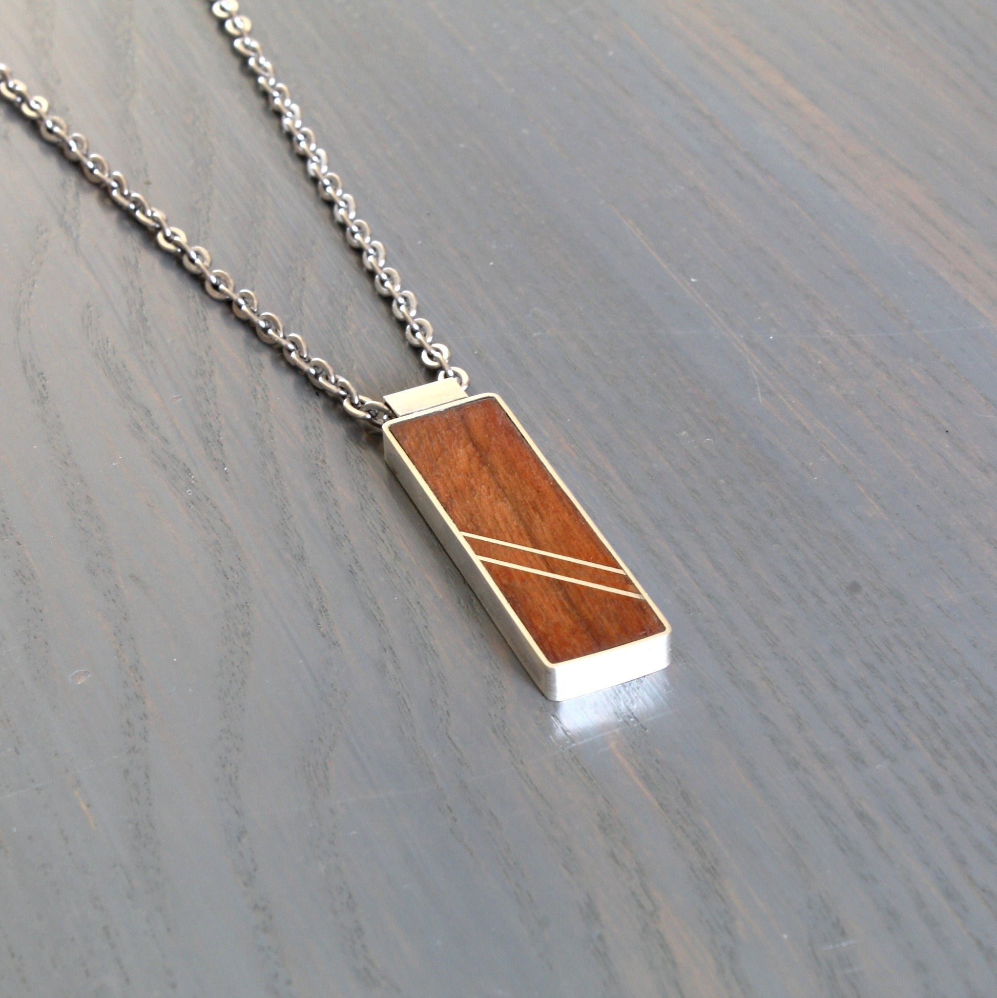 Handcrafted in your choice of walnut or cherry with two parallel angled silver inlays. Sterling silver border and bail.