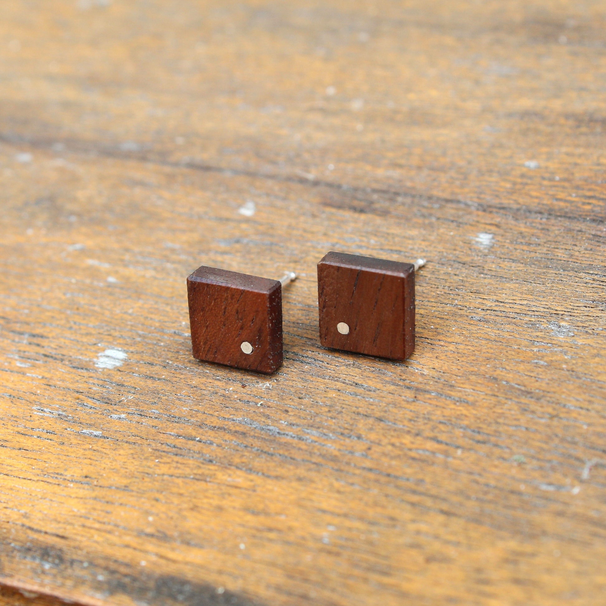 These contemporary walnut studs have a dot inlay of silver to add the perfect accent. Each stud is backed with solid sterling silver.