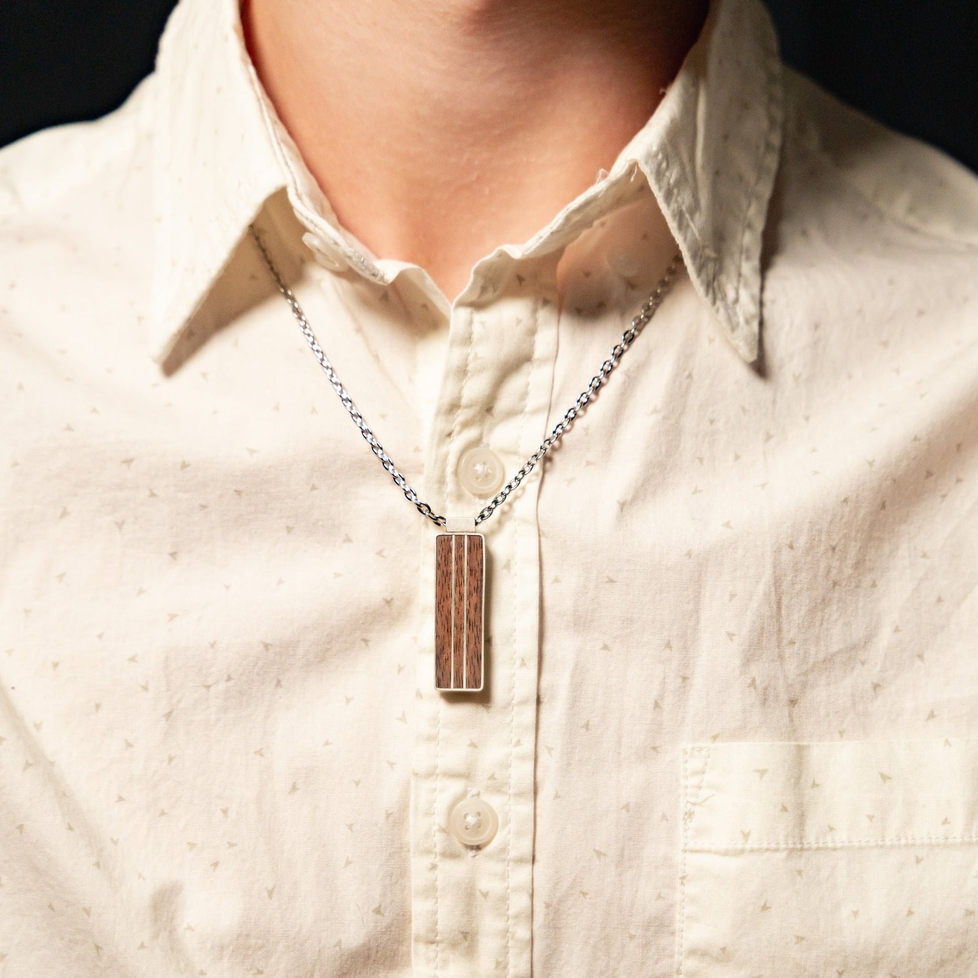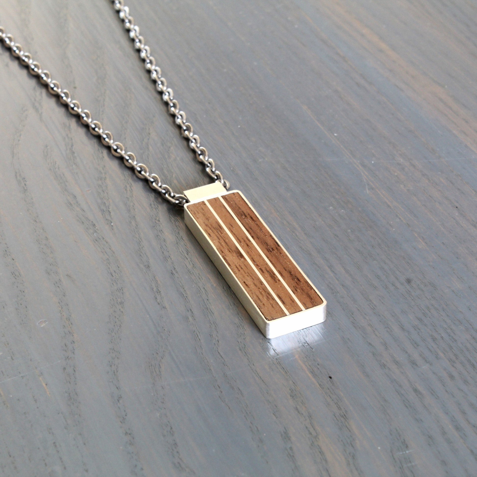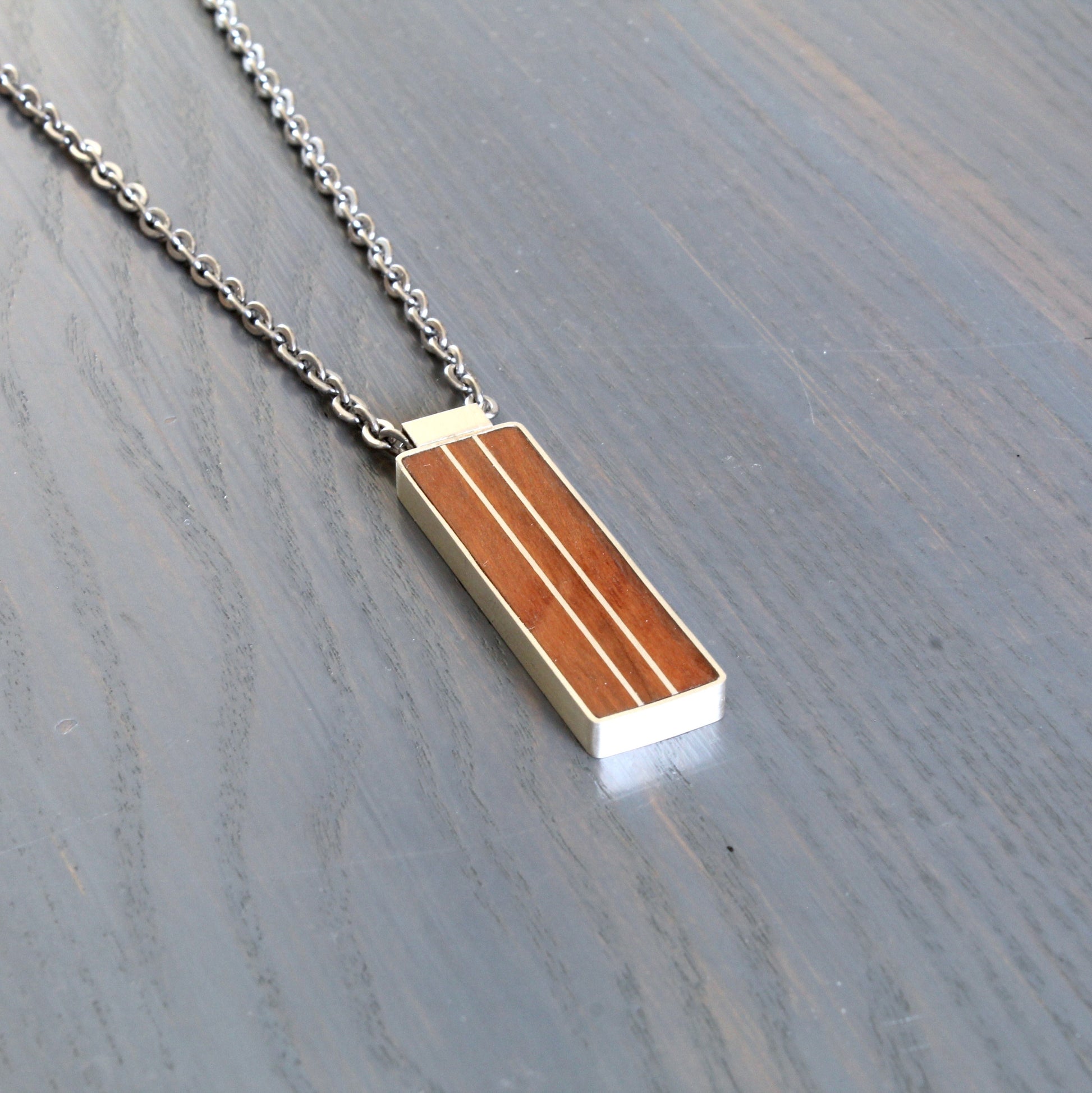Handcrafted in your choice of walnut or cherry with two parallel silver inlays. Sterling silver border and bail.