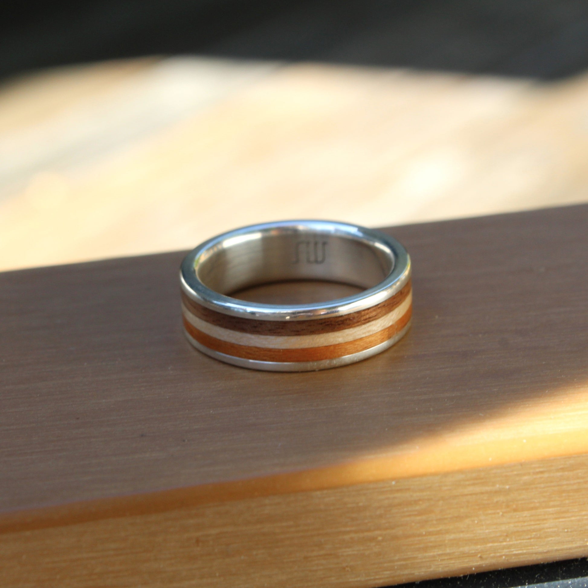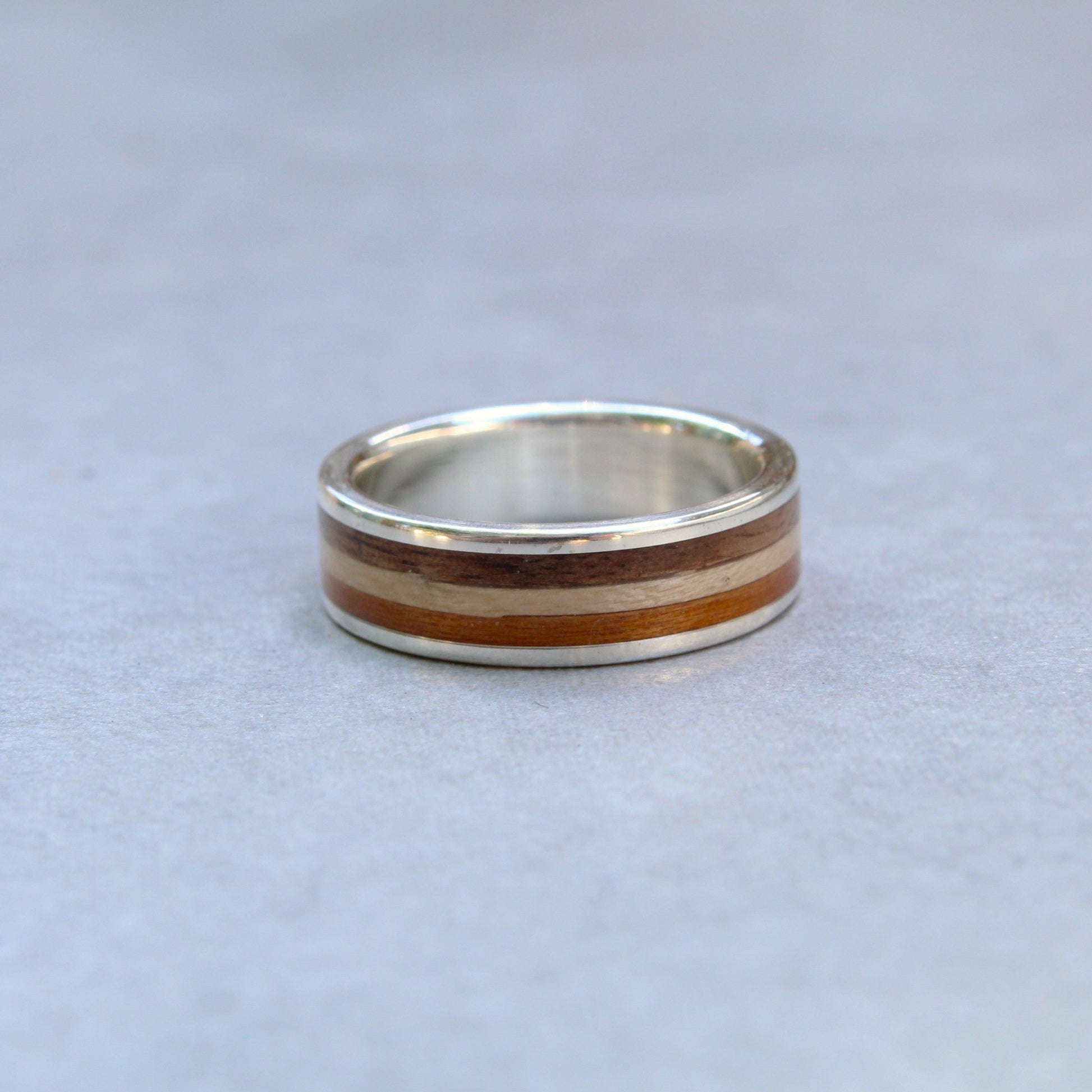 This tri-tone inlay on silver has a warm natural aesthetic perfectly styled in the midcentury collection. Crafted with walnut, maple, and cherry.