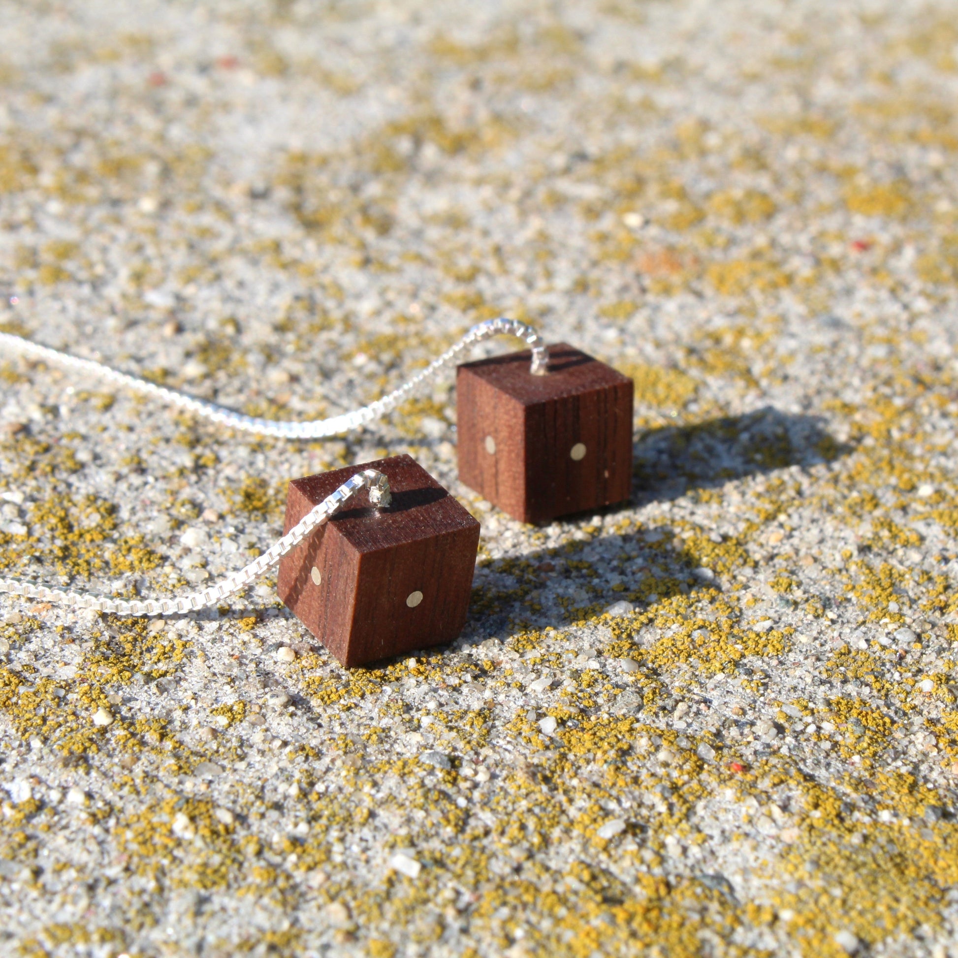 Modern, funky, and chic all into one pair of earrings. These minimal threaders are made of walnut with silver inlays on each face inspired by the iconic snake eye dice.