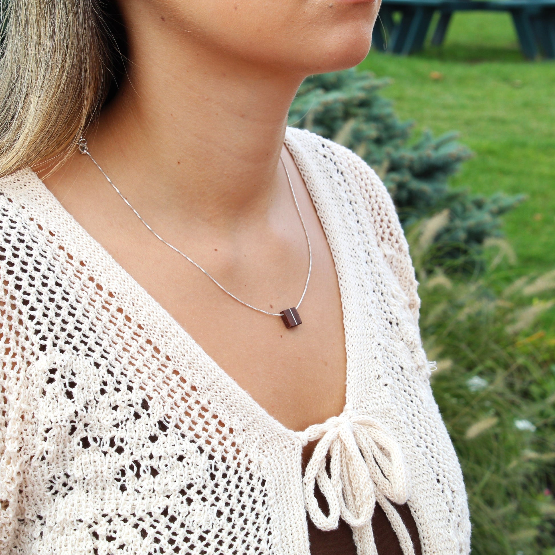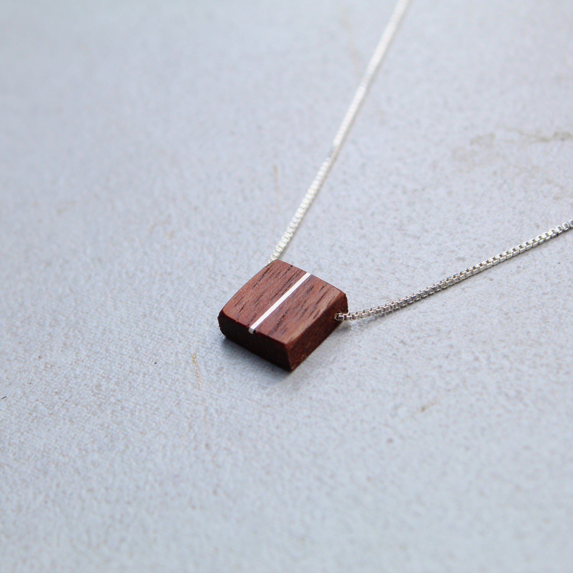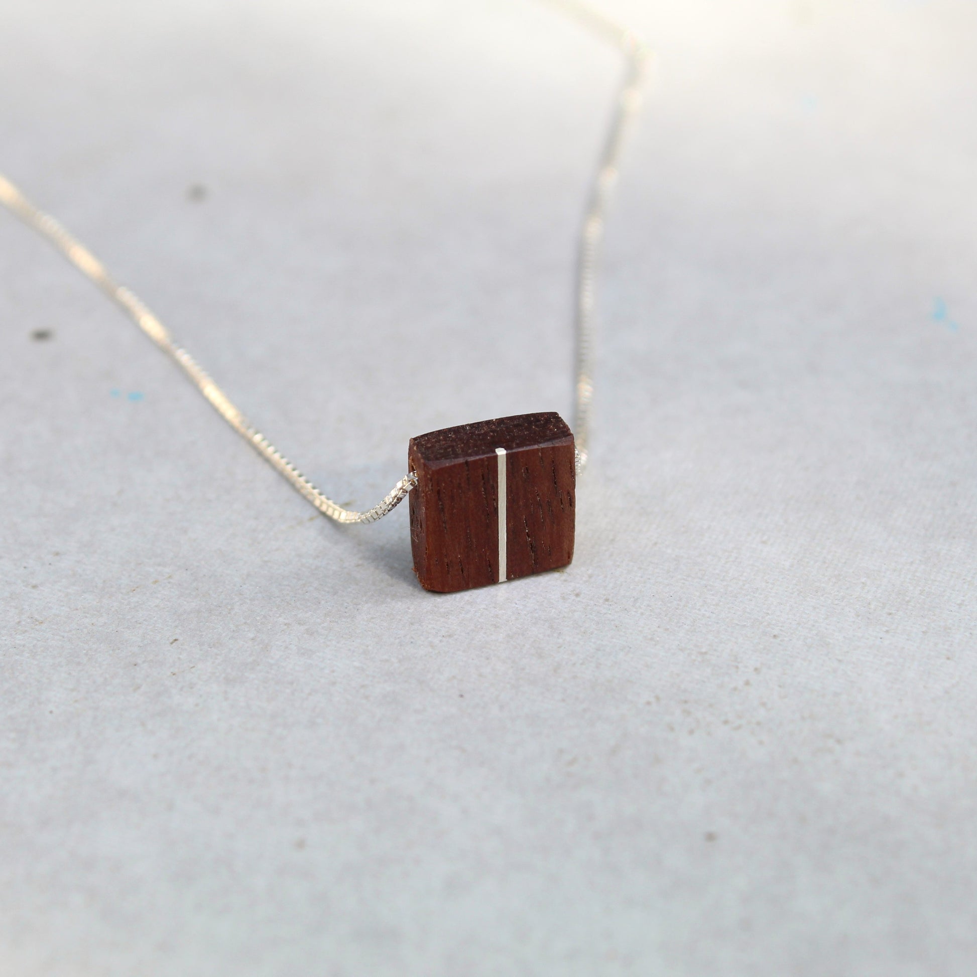 This dainty square necklace is made from walnut contrasted with a vertical inlay of silver. It compliments many looks and can be layered or used as a standalone piece.