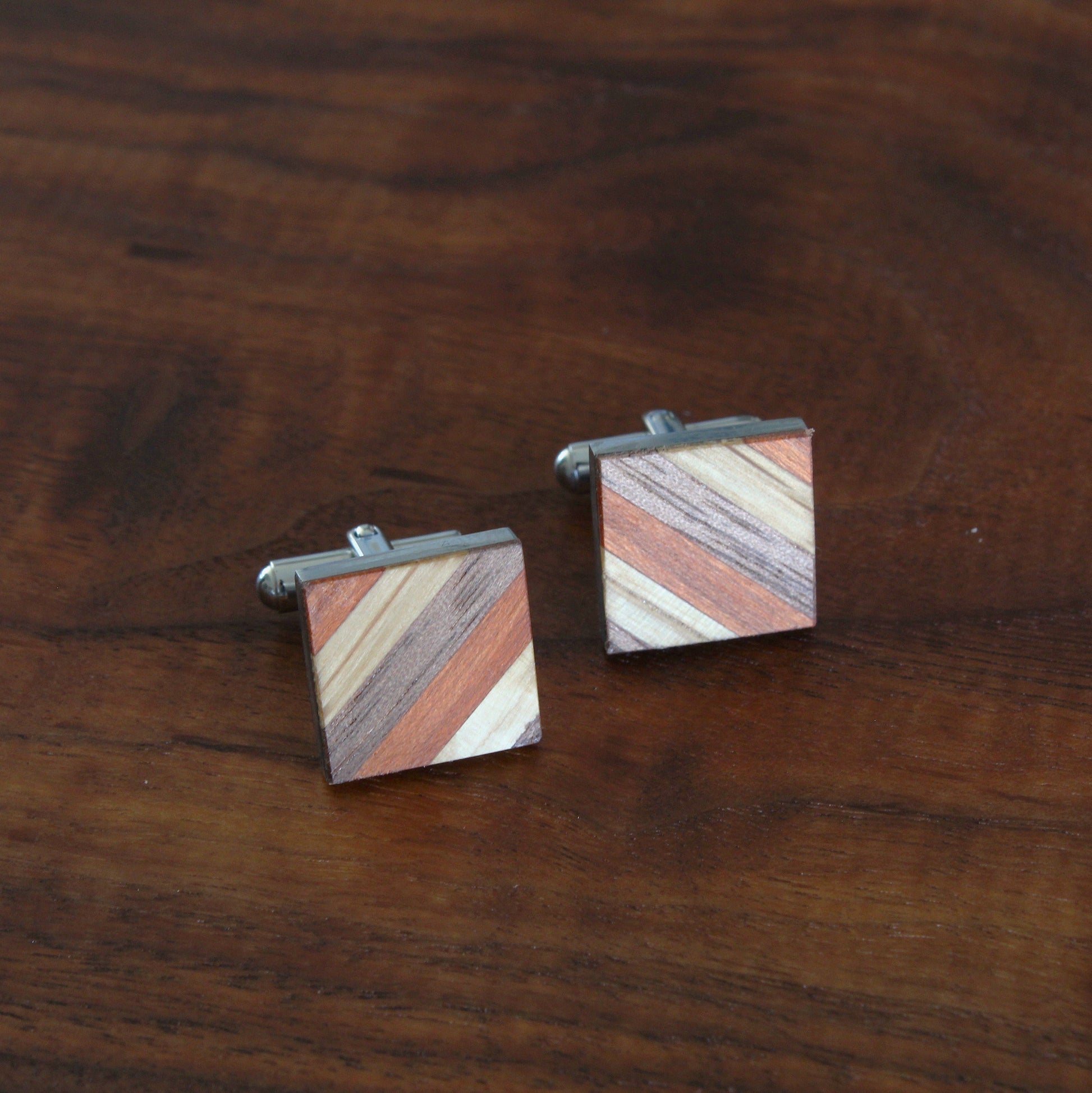 These modernist style striped cufflinks capture unique style while retaining a classic aesthetic. Featuring Walnut, cherry, and oak.