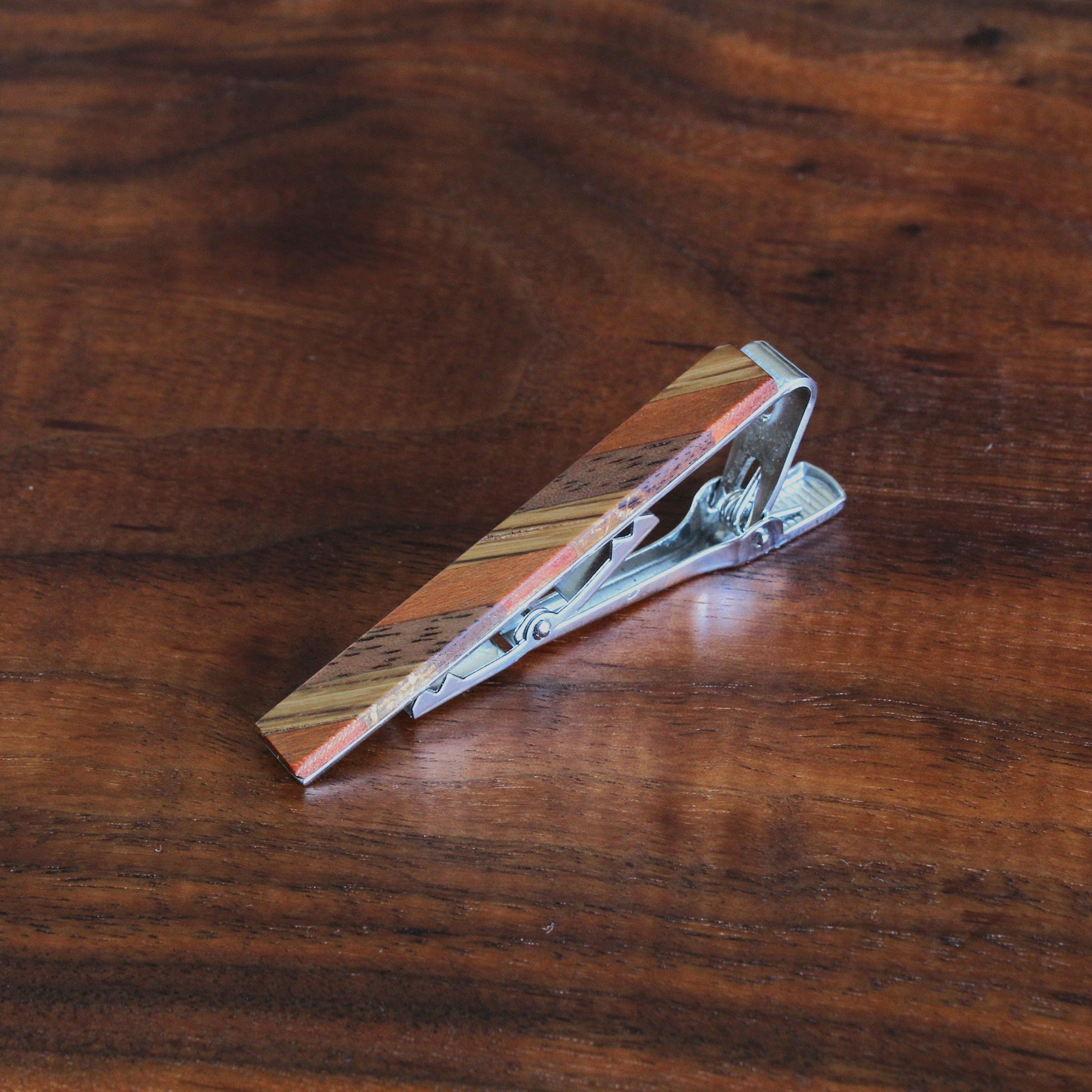 A unique tie clip crafted with walnut, cherry, and oak. Finish this look with our matching striped cufflinks.