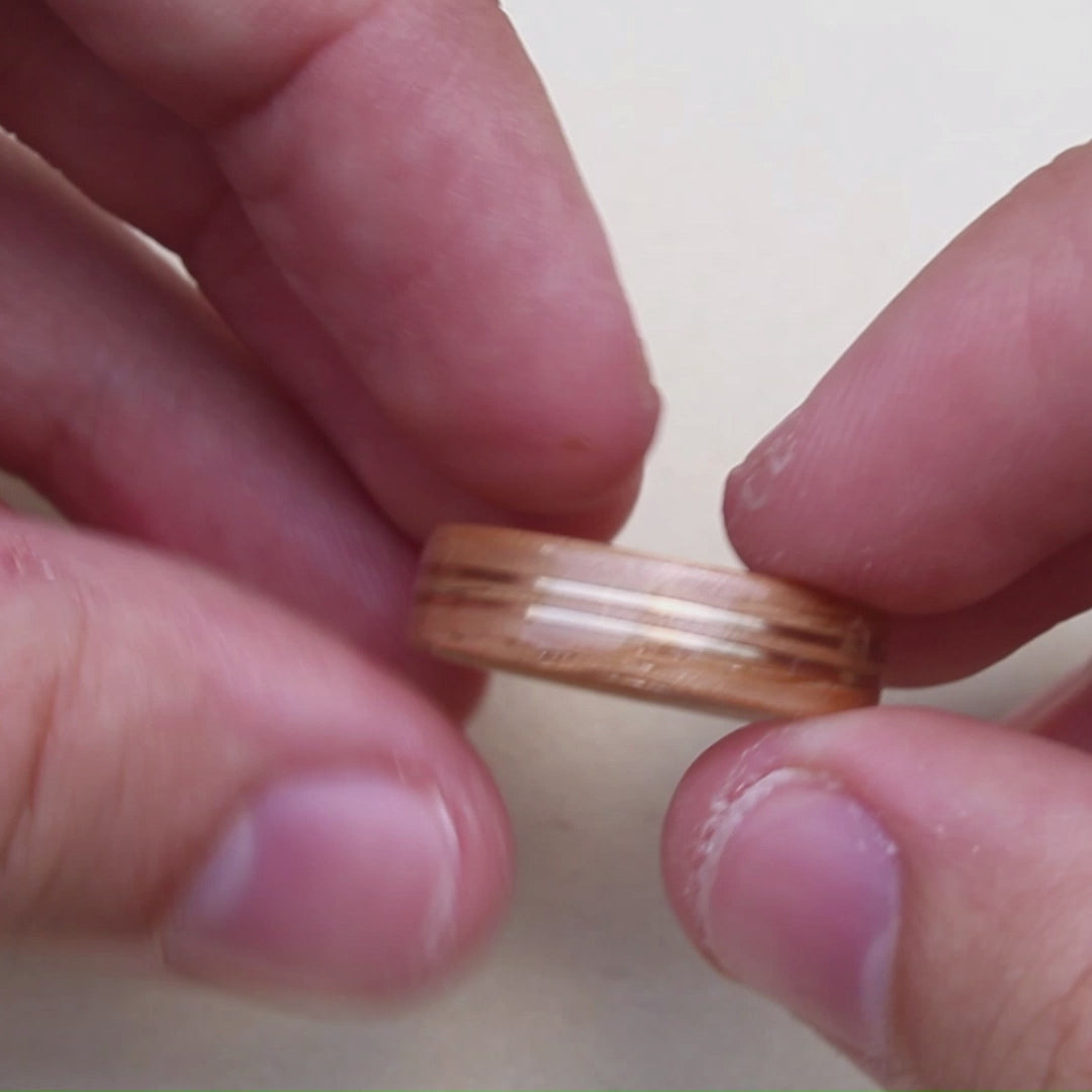 Red oak is an exceptional wood as it is not only durable and used widely throughout the U.S., but its natural grain is also beautifully intriguing. Two gold center inlays make this ring bold while retaining a classy minimalist look.
