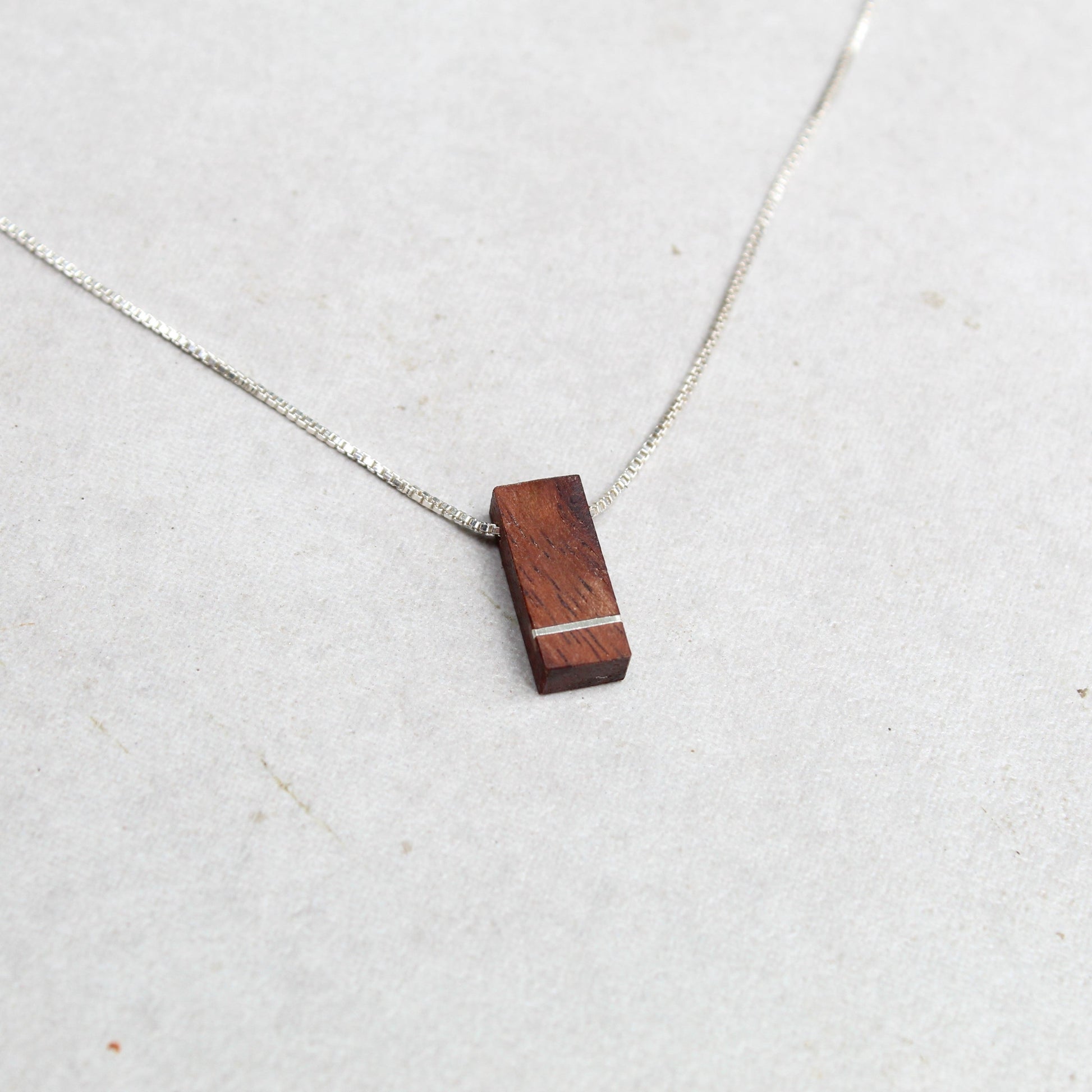 This dainty necklace is made from walnut with an inlaid section of silver creating a distinguished contrast and minimalist aesthetic.
