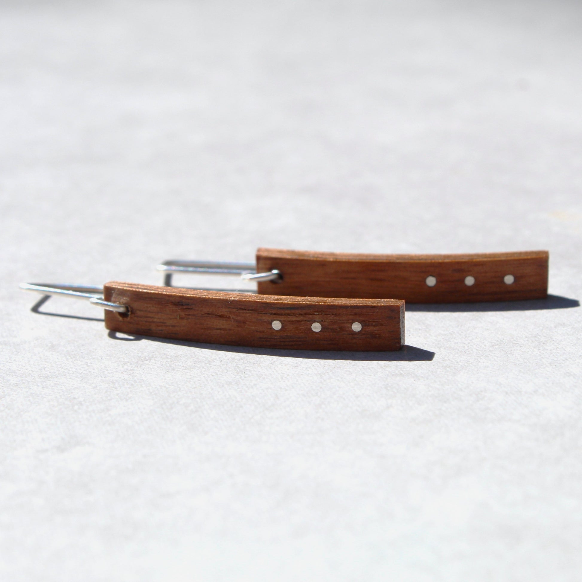 These earrings feature three fine silver dots cascading down the bottom edge of each earring onto a wood base. The ear wires are made from a tarnish resistant silver alloy perfect for everyday wear or for that special occasion.